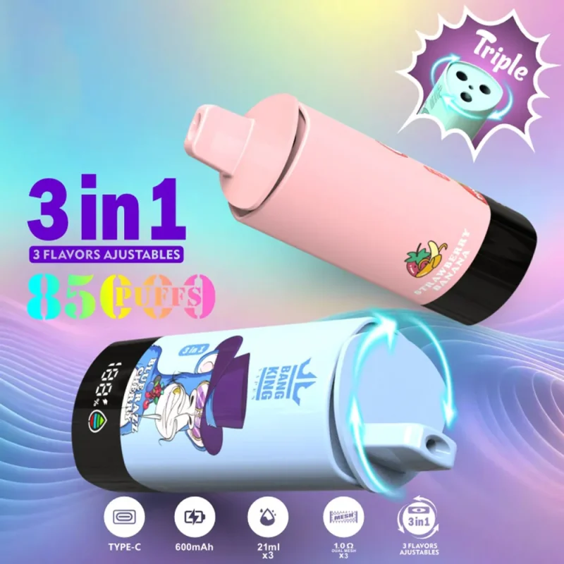 The Bang King Triple 85K is built around one core idea: maximum variety without sacrificing performance. Instead of carrying multiple devices, users get three independent flavor chambers in one unit, combined with extremely high puff capacity and stable mesh coil output.